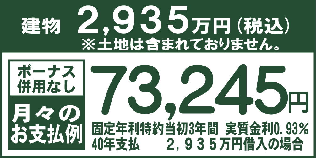 ※価格には、家具、カーテン、外溝工事、地盤改良工事、杭工事、登記関係費用、金融機関の諸経費用は含まれておりません。