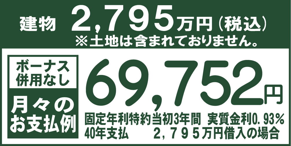 ※価格には、家具、カーテン、外溝工事、地盤改良工事、杭工事、登記関係費用、金融機関の諸経費用は含まれておりません。